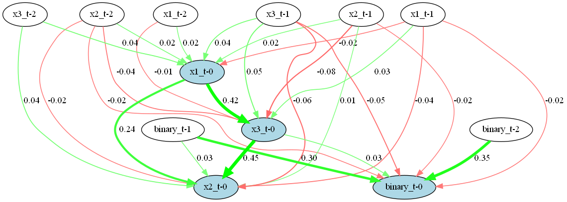 import numpy as np import pandas as pd from scipy import stats import pydot import colorsys from sklearn.preprocessing import StandardScaler from statsmodels.tsa.ar_model import AutoReg # サンプルデータの生成 np.random.seed(0) n = 1000 x1 = np.random.randn(n) x2 = 0.5 * x1 + np.random.randn(n) x3 = 0.3 * x1 + 0.5 * x2 + np.random.randn(n) binary = np.random.binomial(1, 0.5, n) data = pd.DataFrame({ 'x1': x1, 'x2': x2, 'x3': x3, 'binary': binary }) # モデルの適用 model = TimeSeriesLiNGAM(lags=2) model.fit_preprocess(data) # DAGの描画 model.plot_dag(data.columns, 'timeseries_lingam_dag.png')